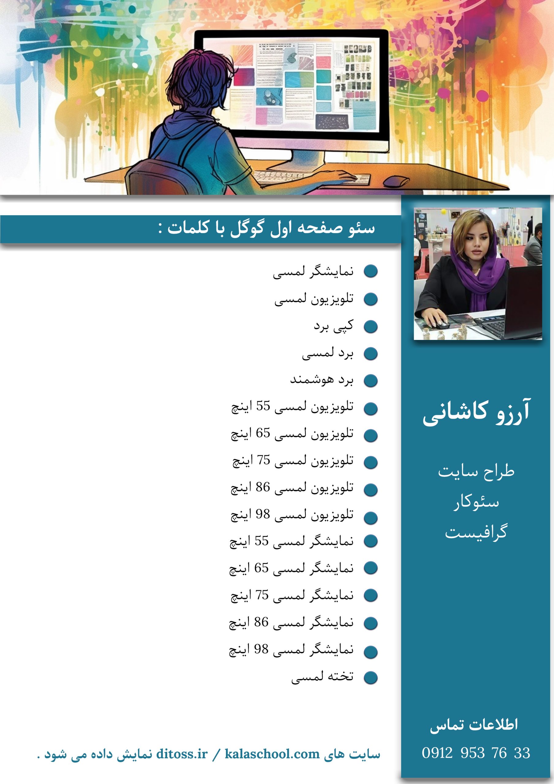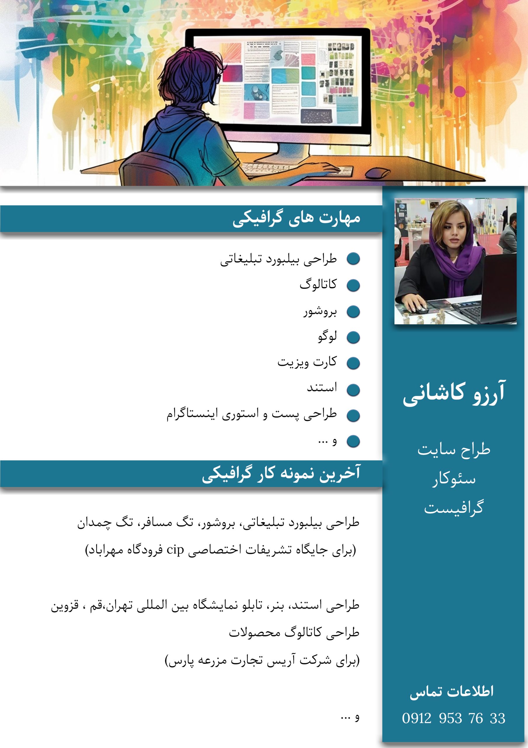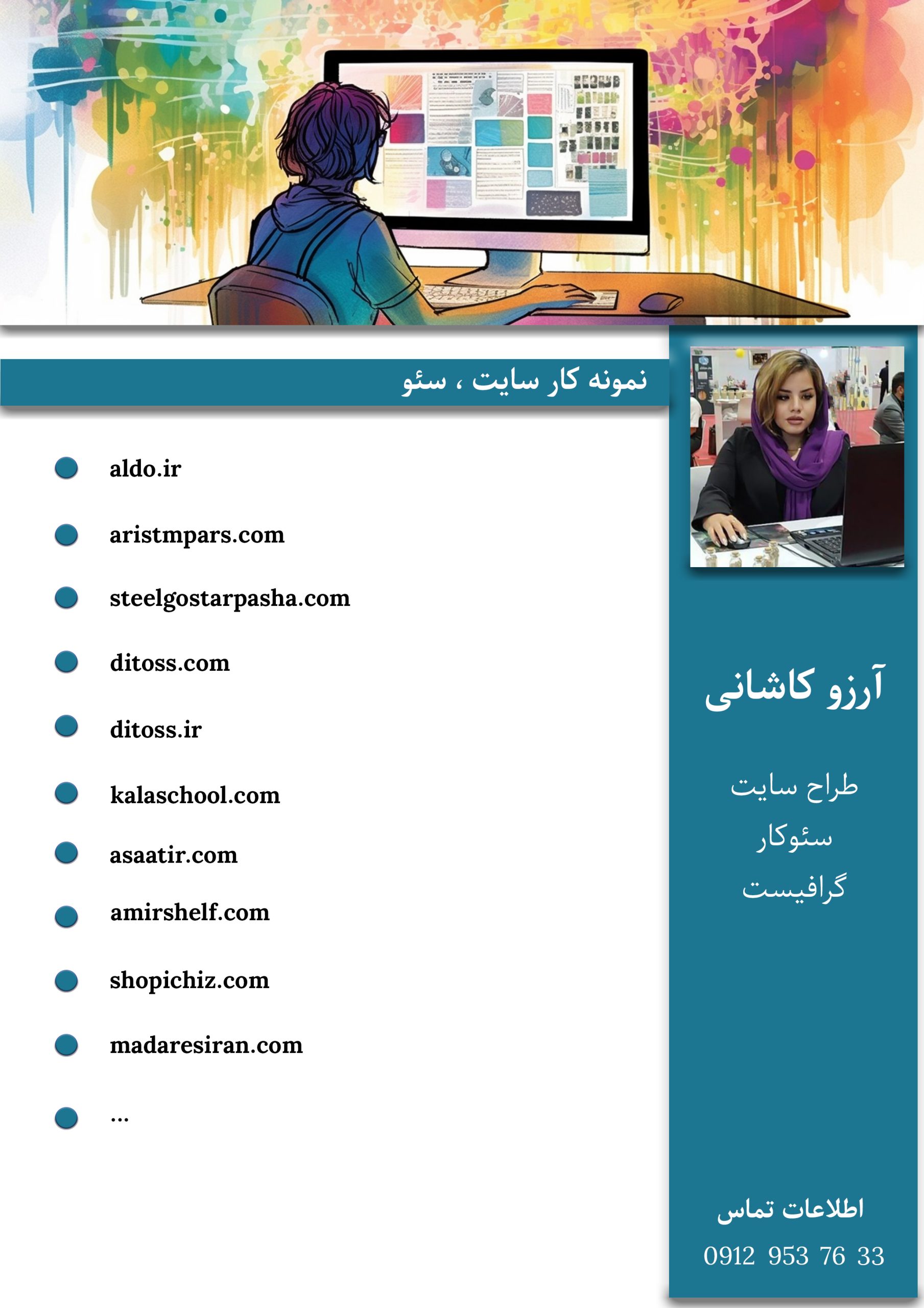 آرزو کاشانی هستم، طراح سایت و گرافیست که از سال 1391 تا الان در زمینه ی انواع طراحی سایت و سئو و کلیه ی کارهای گرافیکی از جمله : طراحی بیلبورد های تبلیغاتی، استند و بنر های نمایشگاه های بین المللی ،بروشور ،کاتالوگ ،کارت ویزیت و … فعالیت میکنم ، من عاشق کارم هستم و سعی می کنم که به بهترین شکل پروژه هامو به مشتریان عزیز تحویل بدم که مورد پسندشون باشه .